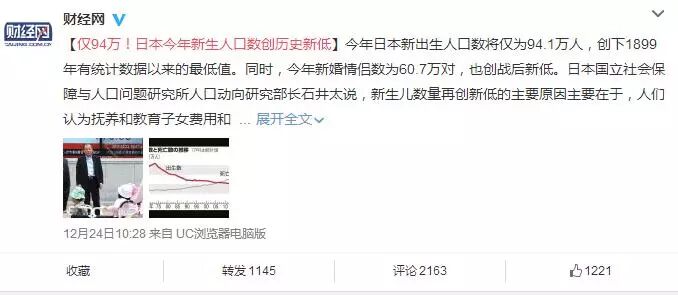 到目前为止,日本育龄妇女的平均出生率只有1.4,一个半不到。日本政府虽然采取了各种补助措施,譬如生孩子补助40万日元,大约2万5000元人民币。孩子出生之后一直到初中毕业,每个月都会有1万日元,大约600元人民币的奶粉钱。但是,不愿意生孩子的女性越来越多,因为一旦生了孩子,就要放弃工作,同时自己将失去自由。因为日本的孩子,都是母亲自己养,爷爷奶奶外公外婆不会帮你带。
